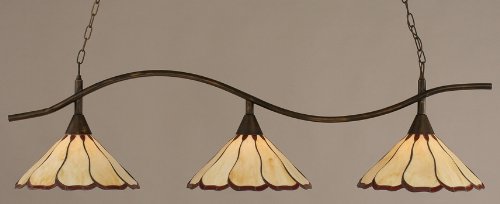 Toltec Pool Table Light Bronze Swoop Bar 16" Honey & Burgundy Flair Tiffany?Comes with 10 in. chain both sides & 11 in. of wire . Requires 3 medium base bulbs (not included) . Maximum bulb wattage: 150W . 60.5 in. L x 16 in. W x 16 in. H